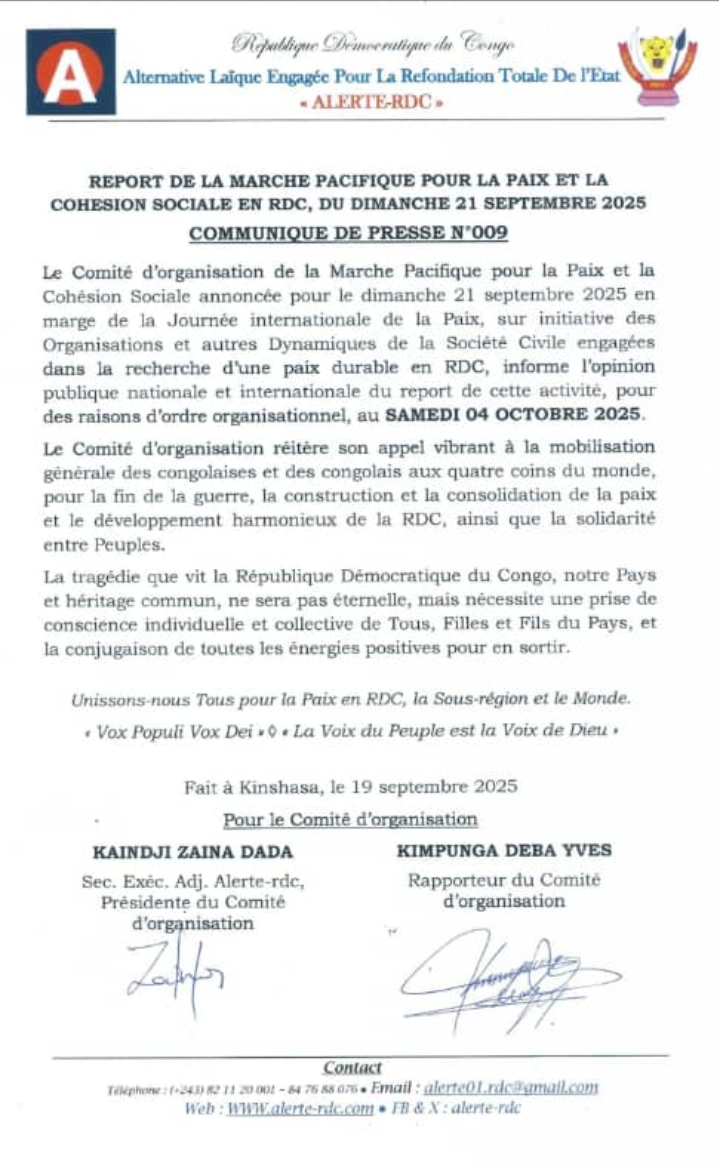 Le Comité d’organisation de la Marche Pacifique pour la Paix et la Cohésion Sociale annoncée pour le dimanche 21 septembre 2025 en marge de la Journée internationale de la Paix, sur initiative des Organisations et autres Dynamiques de la Société Civile engagées dans la recherche d’une paix durable en RDC ;